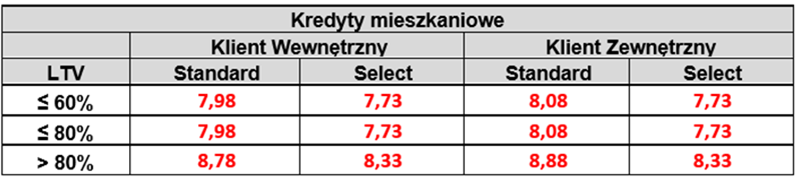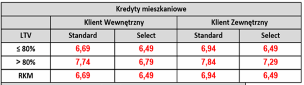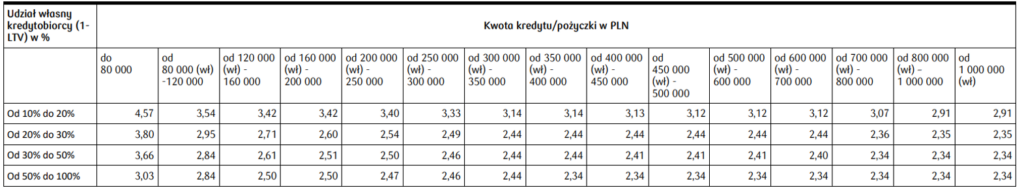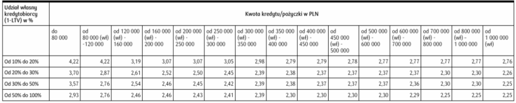 7,02% dla wkładu własnego ponad 20% a po upływie 5 lat marża wyniesie 2,0% + WIBOR 1M.