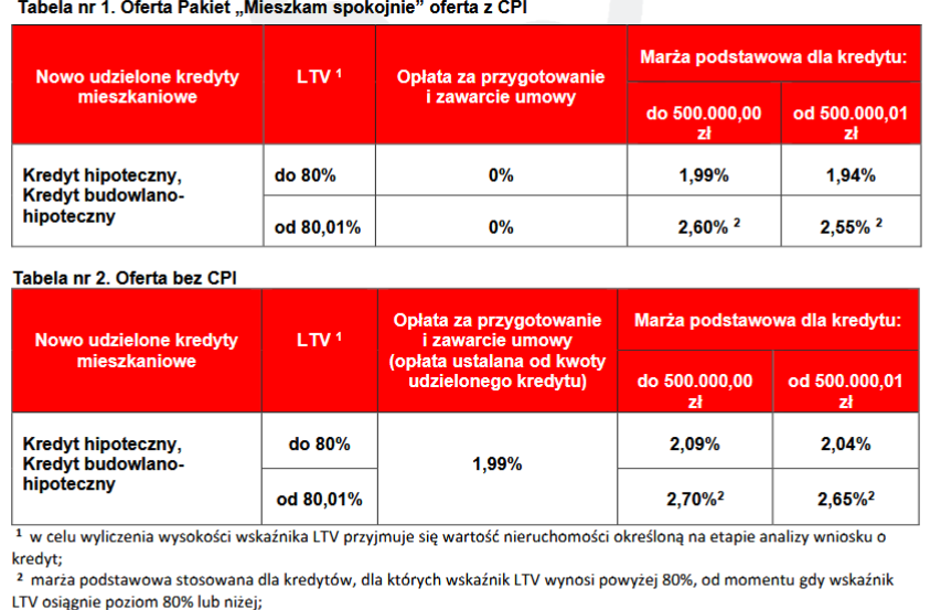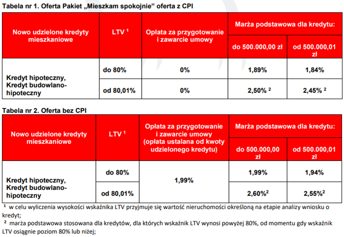 Pierwszy to tzw. lekka rata. Prowizja bankowa wynosi 1,5% a oprocentowanie stałe w pierwszych 5 latach 7,03% a po tym okresie zmienne 1,70% +WIBOR 1M.