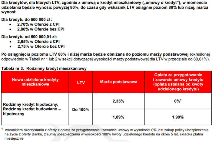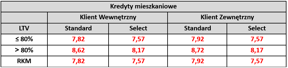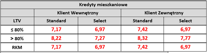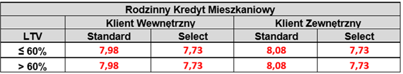 7,04% dla rodzinnego kredytu mieszkaniowego dla kredytów z wkładem własnym 0%.