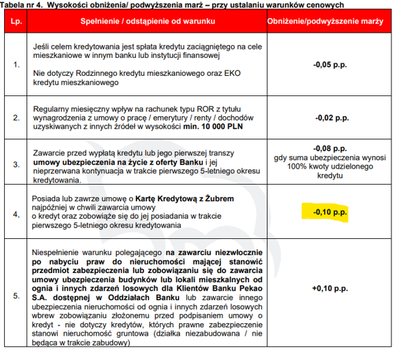 Brak spełnienia warunków będzie skutkował podwyższeniem marży o 0,5%. za brak ROR lub wpływów 1500 zł/m-c lub zrezygnuje z bankowości mobilnej lub transakcyjności. O 1,0% w przypadku rezygnacji z ubezpieczenia na życie.
