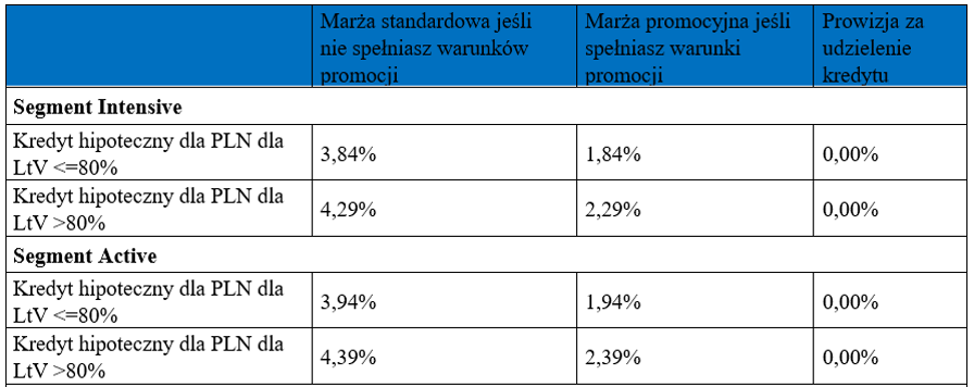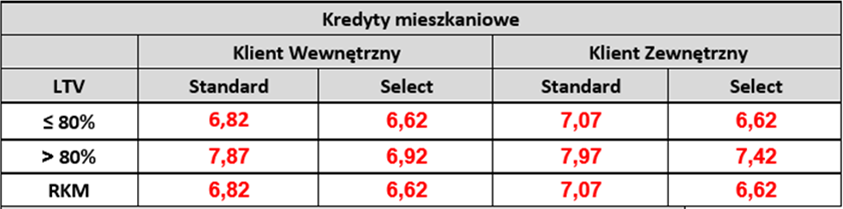 Można dodatkowo obniżyć kredyt na nieruchomość energooszczędną wszyscy klienci – 0,20p.p . Najniższe oprocentowanie dla promocji z segmentem Intensive 80% – 7,08.