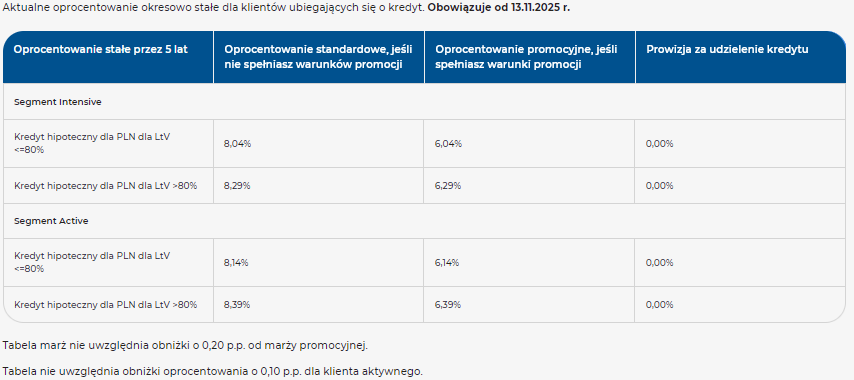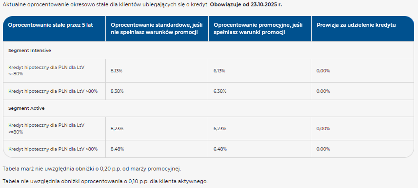 Od 08.12.2025 r. mBank wprowadza obniżkę stałego oprocentowania. Ponadto bank posiada dodatkowy bonus dla swoich, aktywnych klientów w postaci obniżki stałego oprocentowania i marży dla oprocentowania zmiennego o 0,10. Aktywny klient to osoba posiadająca w mBanku dowolny produkt od min. 6 m-cy przed złożeniem wniosku na kredyt hipoteczny. Dla inwestycji ekologicznych bank oferuje dodatkową obniżkę promocyjną oprocentowania stałego i marży dla zmiennego o 0,2%. Obydwie te obniżki sumują się. Poniższe tabele nie zawierają tych obniżek. Teraz wysokość stałego oprocentowania wynosi: