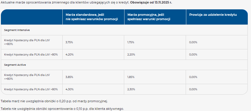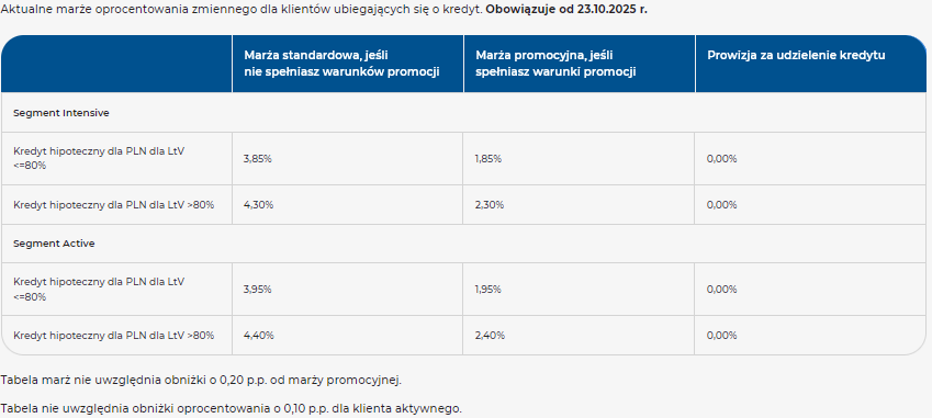 Od 01.12.2025 r. Millennium Bank obniża o 0,30% stawki stałego oprocentowania kredytów hipotecznych. Dotyczy to kredytów z oprocentowaniem stałym w pierwszych 5 latach spłaty jak i zmiennego po tym okresie. Millennium nie ma w swojej ofercie kredytów ze zmiennym oprocentowaniem a minimalny wkład własny to 20%.