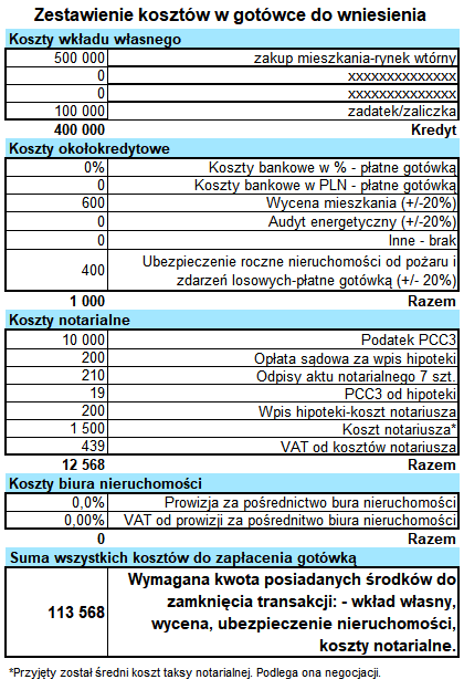 Aby uniknąć sytuacji w których klient zaskoczony zostaje wysokością dodatkowych kosztów, jakie musi zapłacić przygotowałem kalkulator. Dzięki niemu każdemu mojemu klientowi w ciągu kilkunastu sekund mogę wyliczyć wszystkie koszty towarzyszące realizacji kredytu na zakup nieruchomości.