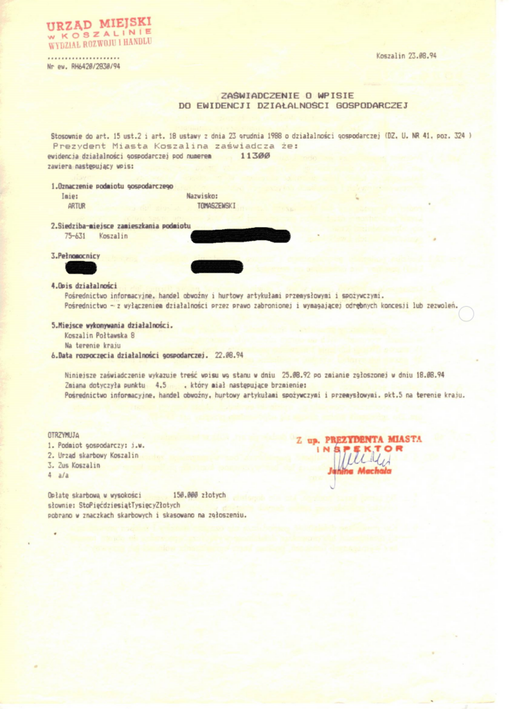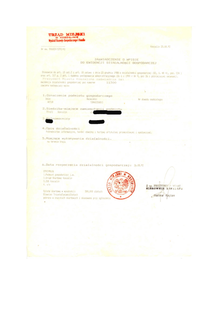 1992 - rozpoczęcie własnej działalności gospodarczej