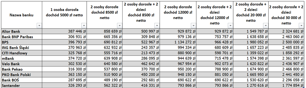 Zawarte w tabeli informacje zostały przygotowane przez największego pośrednika kredytowego w Polsce – firmę Expander. Wyliczenia zdolności kredytowej wykonane zostały na podstawie danych przekazanych przez banki. Do wyliczeń zostały przyjęte następujące założenia: